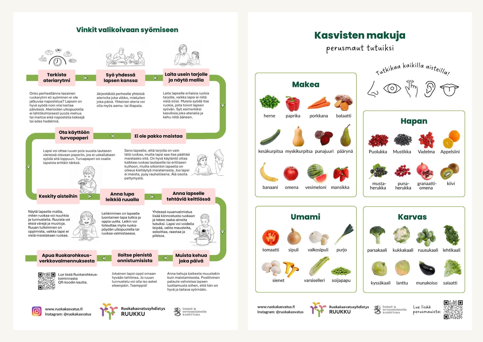 Esitteeseen on koottu käytännönläheisten vinkkien polku lapsen syömispulmien hoitoon ja ruokarohkeuden löytämiseen. Toisella puolella esitettä on kuvitettuja ideoita eri makujen harjoiteluun.