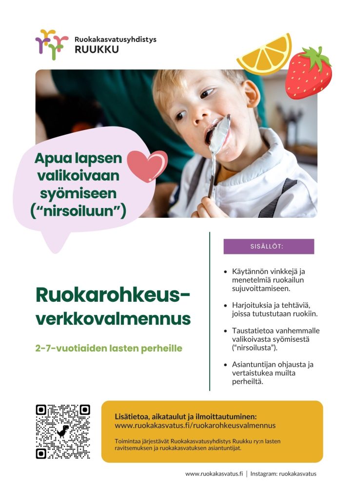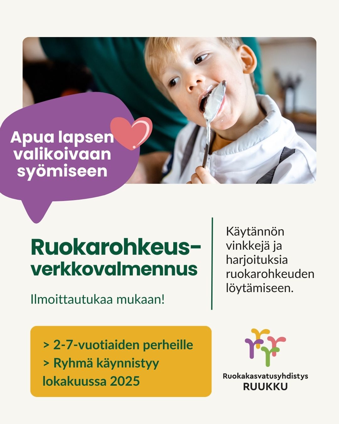 Onko perheessäsi valikoivasti syövä lapsi? Kaipaatko ideoita ruokarohkeuden löytämiseen? Ruokakasvatusyhdistys Ruukku ry:n valmennuksessa tarjotaan apua 2–7-vuotiaan lapsen valikoivaan syömiseen.