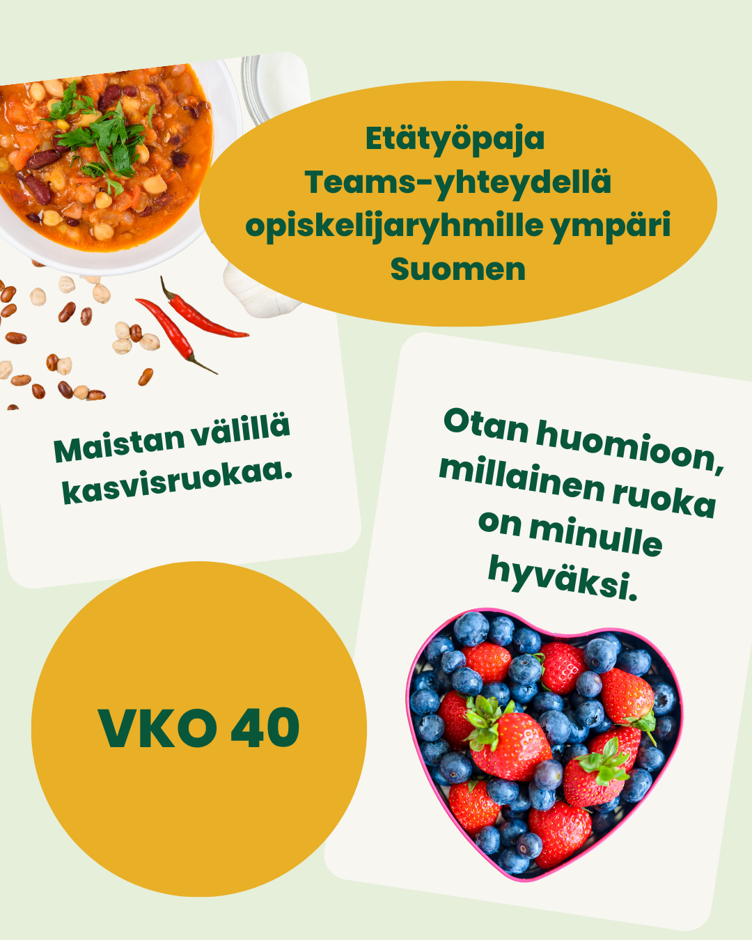 - Käytännönläheisiä harjoituksia, jotka lisäävät tietoa, taitoa ja ruuasta innostumista.